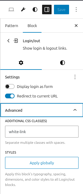 Next, go to the element you want to style. I did this for WPUser’s Login/Out link, which is in a Navigation element. I selected the link, and then Advanced (at the bottom of the block properties), and added “white-link” to the Additional CSS Classes box.